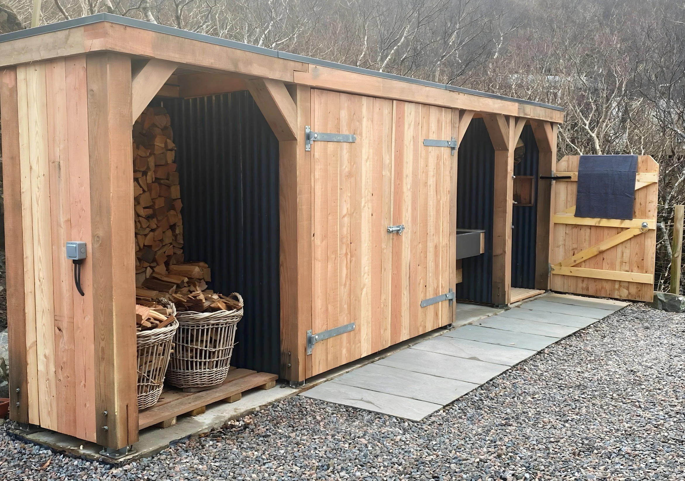 A secure, weather‑sheltered store provides space if you would like to bring kayaks or bikes, making it easy to keep equipment dry and organised throughout a stay. A wood store sits alongside it, kept fully stocked so there’s no need to bring logs from home. After time on the water, a hot outdoor shower sits in a private, sheltered corner, next to a deep basin with hot water for rinsing wetsuits, boots and sandy gear before heading indoors.